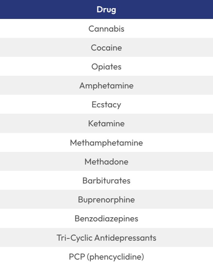 The test detects drugs that have been ingested or used over a period of time. Common drugs tested include:
